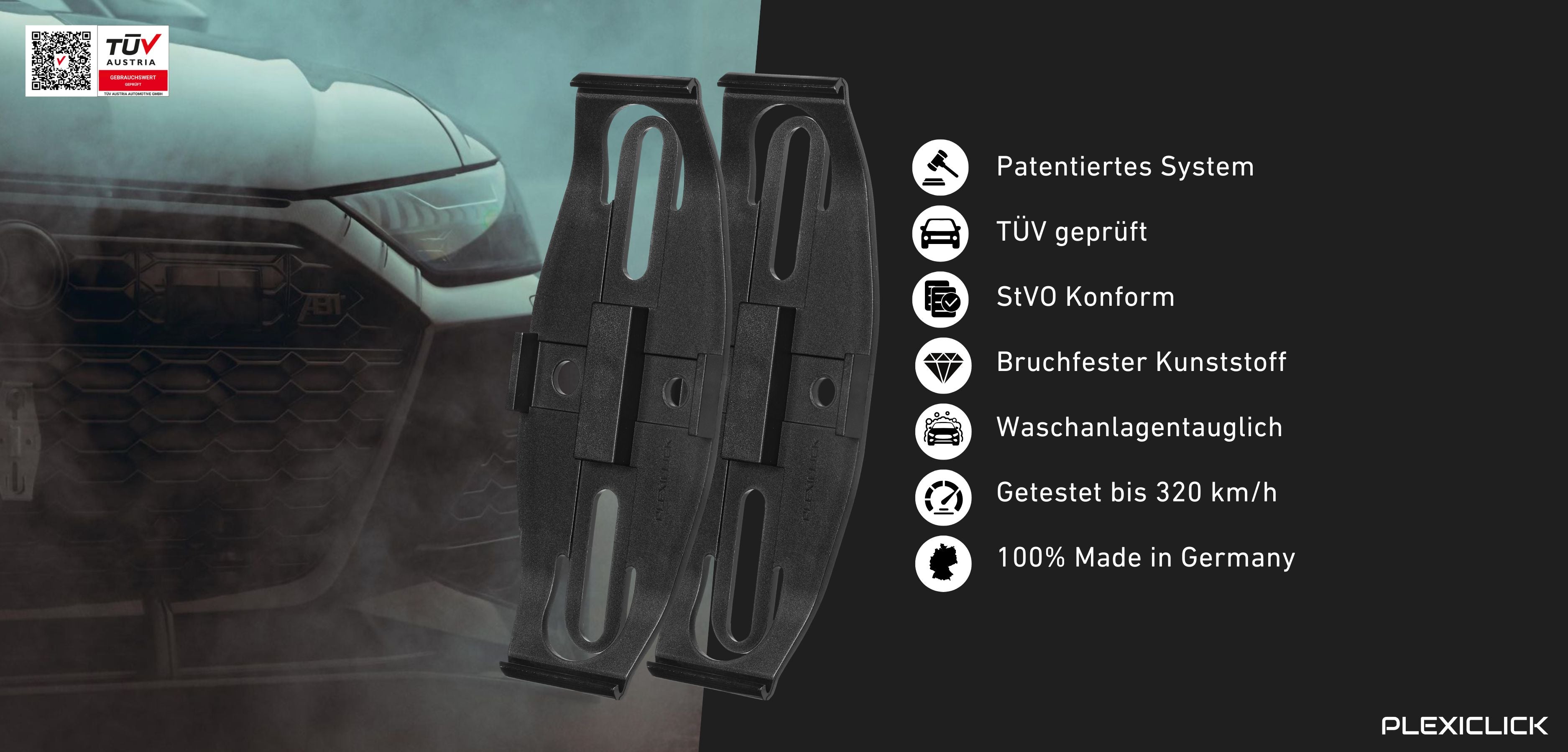 - 🔧 4x PLEXICLICK® V2 Kennzeichenhalter zur Montage von zwei Kennzeichen