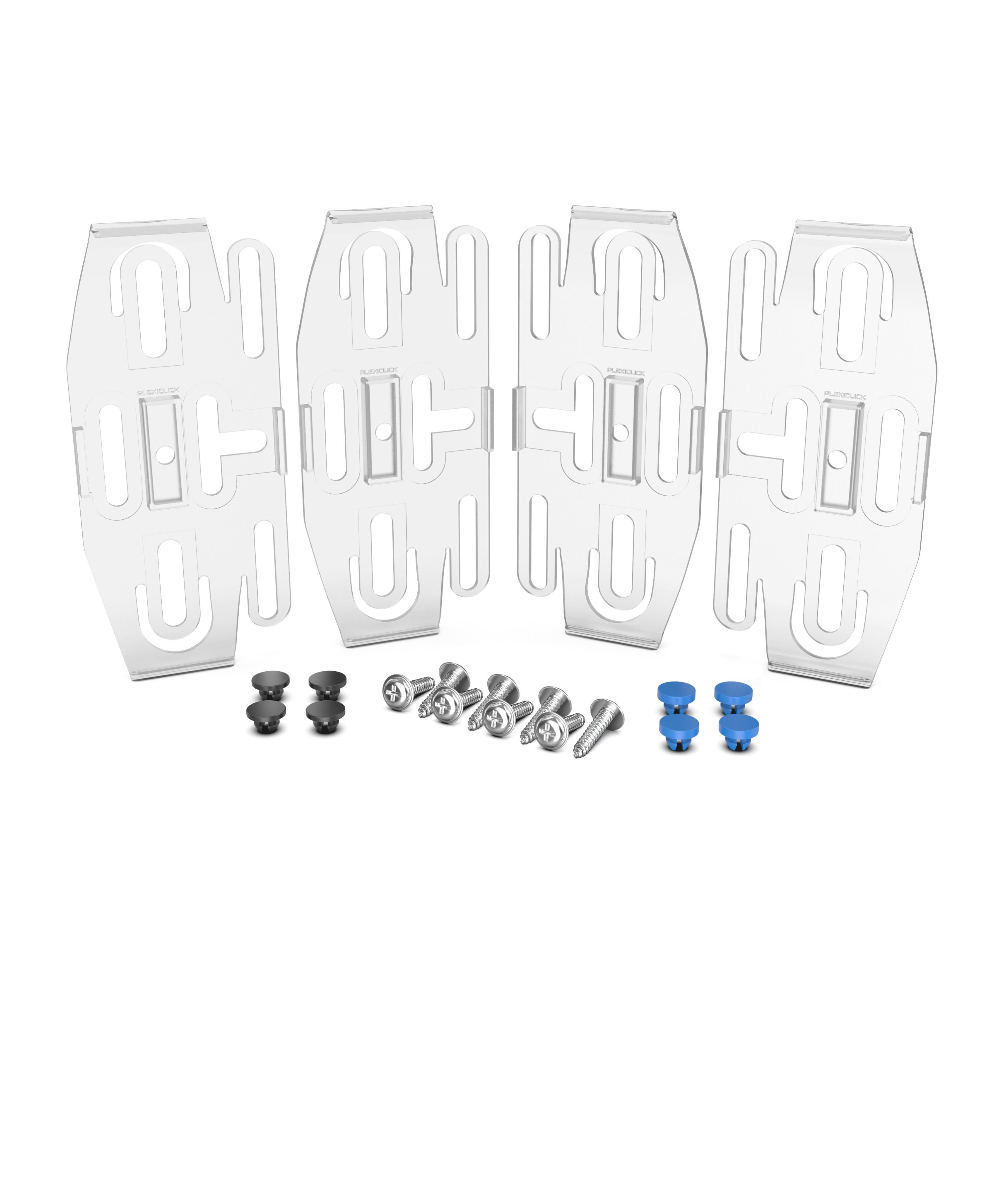 Each delivery includes 4x Plexiclick® clips for mounting two license plates.